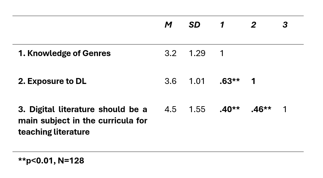 To assess these relationships, a statistical test was conducted to measure the Pearson correlation coefficient between the following variables: exposure to digital literature, knowledge of digital literary genres, and belief that digital literature should be a main subject in the curricula for teaching literature.