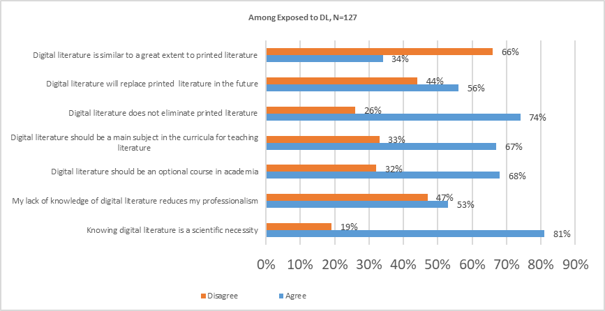 Figure 2 shows that the vast majority (67%) of those exposed to digital literature believe that it should be included as a major subject in literature curricula, while 68% believe that it should be an optional course in academia. Overall, 81% agree with the assertion that knowing digital literature is a scientific necessity, while 53% agree with the assertion that lack of knowledge of digital literature reduces the professionalism of the learner.