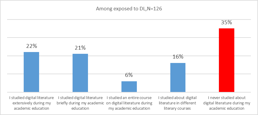 The results also show that 22% of those exposed to digital literature studied it extensively, 21% studied it briefly, only 6% completed a dedicated course in it, and 35% did not study digital literature at all during their academic training.