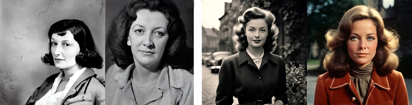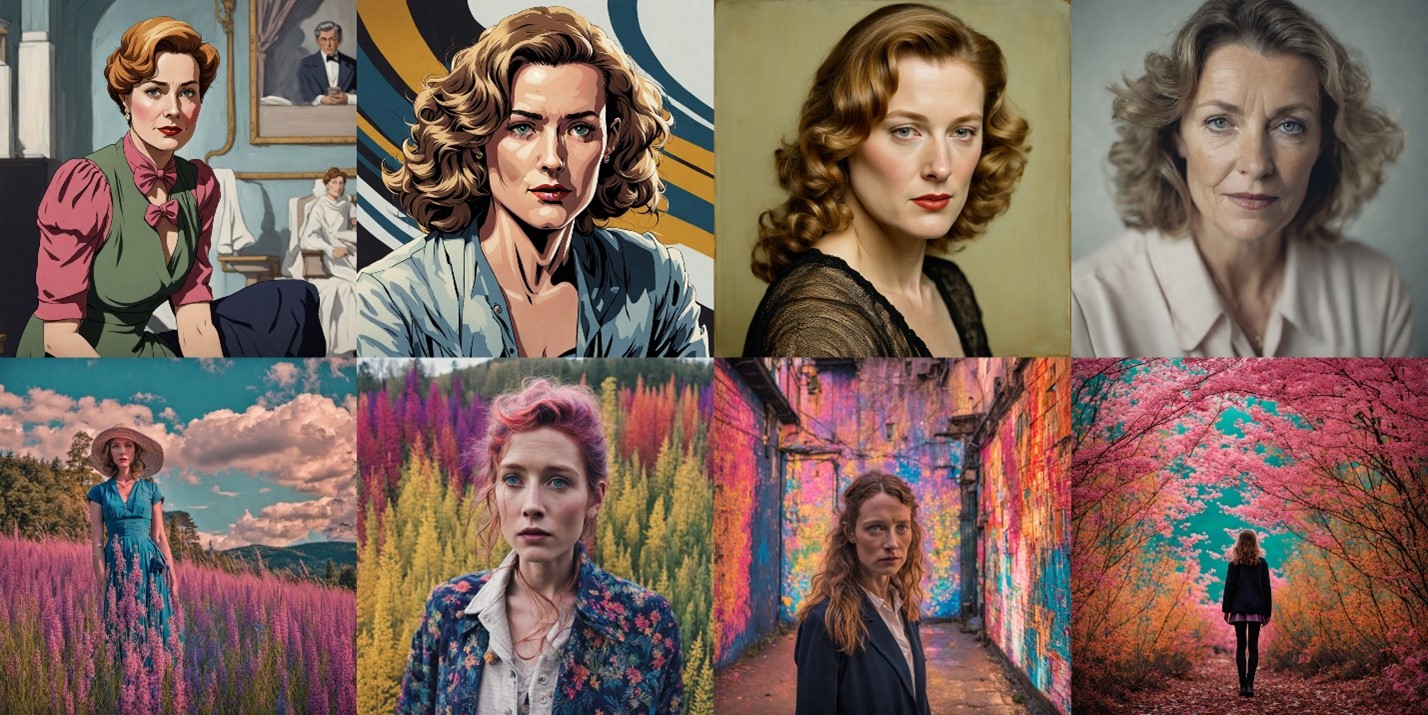 For all its egregious whitewashing, this set is more aesthetically satisfying than the 2023 example—among other things, Stable Diffusion’s consistency of aspect ratio, and its treatment of eyes and clothing, have considerably improved. The costumes, hairstyles, and settings have strong historical plausibility. The similarity of faces seems tighter as well, though again there is perhaps more likeness between each of the lateral pairs (1-2 and 3-4) than overall. It is worth remembering that any resemblance at all is remarkable. Notice that the Claires in this set look very little like those from 2023. Continuity within the later sequence is doubly remarkable. As they are products of discrete operations, there is no evident reason for consistency, other than whatever constraint the name “Claire Tourneur” places on the system. There is no indexical Claire to serve as reference. Every image is an invention.