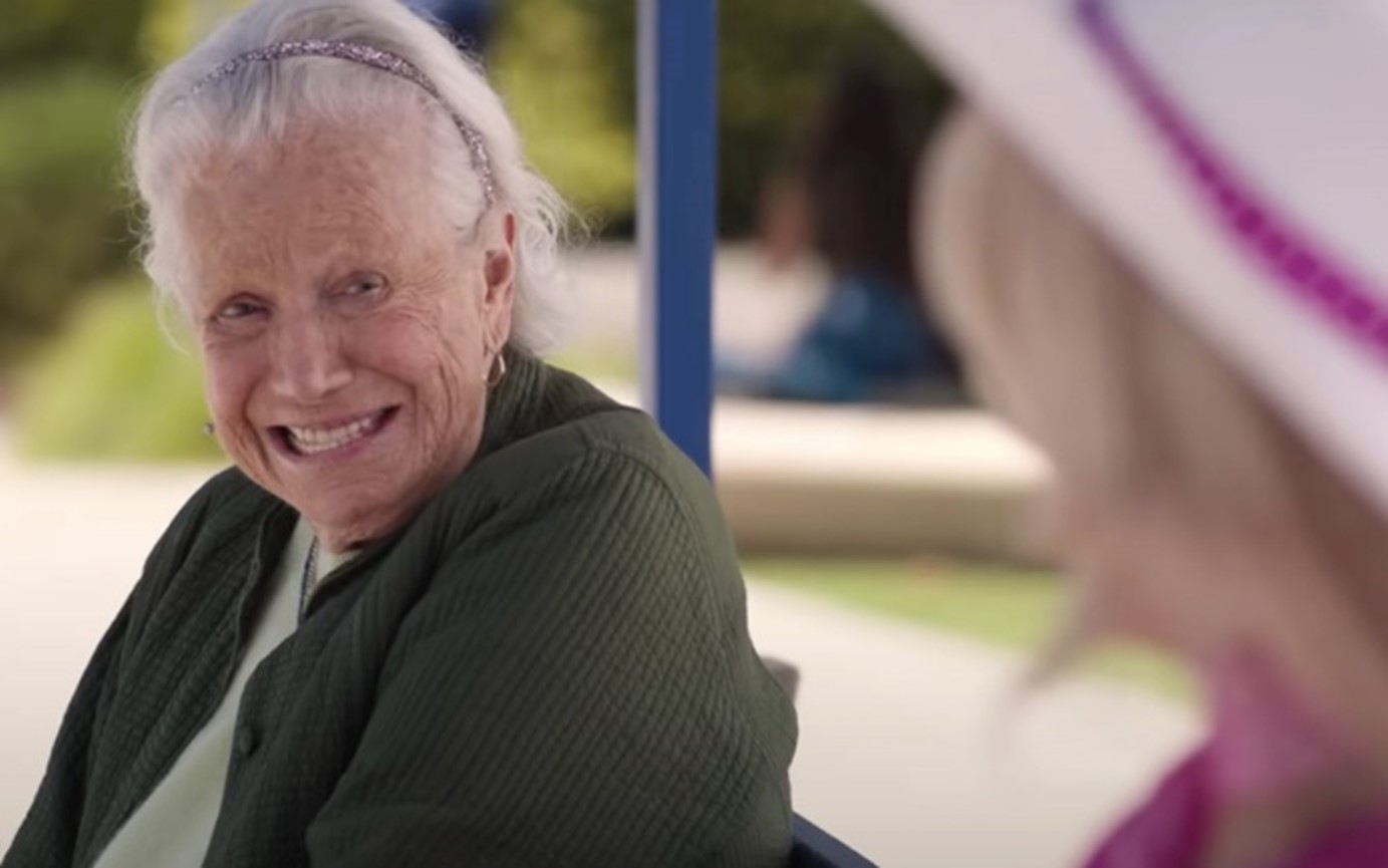 Several things are noticeable about the character credited as “The Woman on the Bench”. Her appearance is frankly presented, with little attempt to disguise thinning hair and age-appropriate complexion. Also, though her performance is flawless, it carries a hint of naturalism that suggests a non-professional actor. In the context of Barbie’s overall standard of glitz, these incongruities signal a cameo scene.