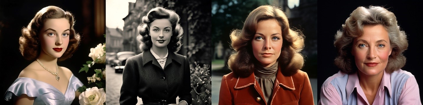 I co-generated this sequence about a year after the images in Figures 2 and 4, to test what Stable Diffusion could do when asked explicitly for a time-and-age series. The images were produced using four discrete prompts in immediate succession: