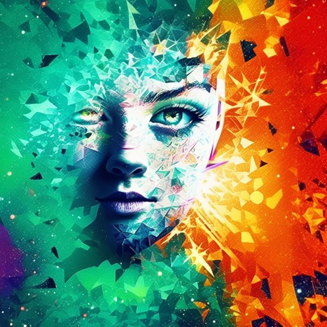 None of the effects in this image were specified in the prompt. The distorted, bespectacled face of the selfist calls to mind Parmigianino (and thus maybe Ashbery) but is basically factitious. The curious geometry, with its Escher-like “strange loop” (Hofstadter 2), comes completely unbidden. Also notable is the textured background, which resembles a fan of shattered safety glass. The suggestion of broken glass could evoke the materiality of cellphones, or perhaps the concept of transgression or rupture implicit in the “meta” move. To dismiss this feature as random flourish seems negligent, though it is hard to know what to say about it. Strictly speaking, it has no meaning, in the sense of intentional expression, but that does not make it insignificant. “Metaselfie” begs for interpretation, even as we are reminded by Chesher and Albarrán-Torres, along with the authors of the “Stochastic Parrots” paper, that it is a mathematically determined convergence of possibilities. Perhaps, as McDaid warns, it is at least partly apophenic — MADE UP IN MY MIND—though another possibility remains.